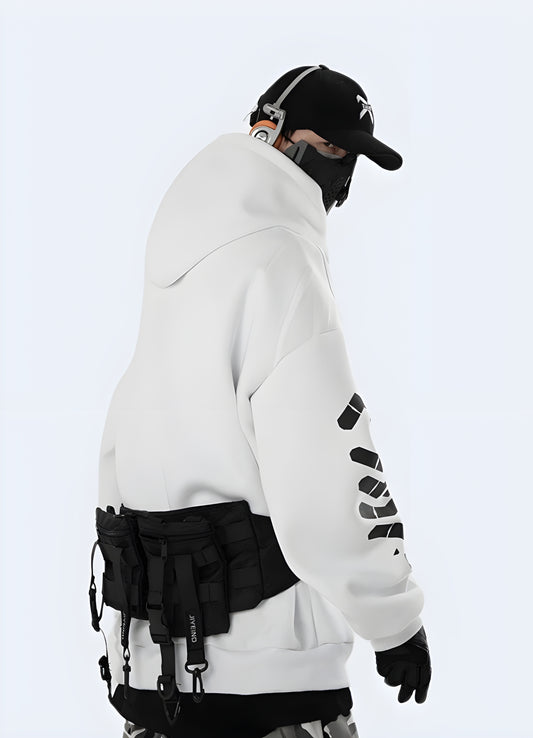 Techwear is known for strapped designs that bridge fashion with function. Hoodies outfitted with straps amp up the tactility while referencing martial arts roots. They allow for easily tying down over layers or packing away when not in use. Models featuring strap systems also structure the fit closer to the body with greater mobility.