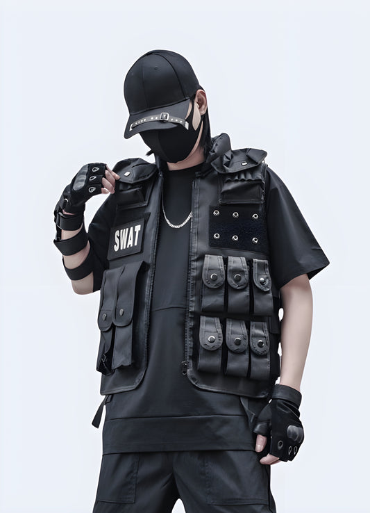 Customise your techwear vest with patches, pins and gear. Fill the pockets and utilise the MOLLE attachment system. Finally, complete the futuristic techwear style with mirrored shades.